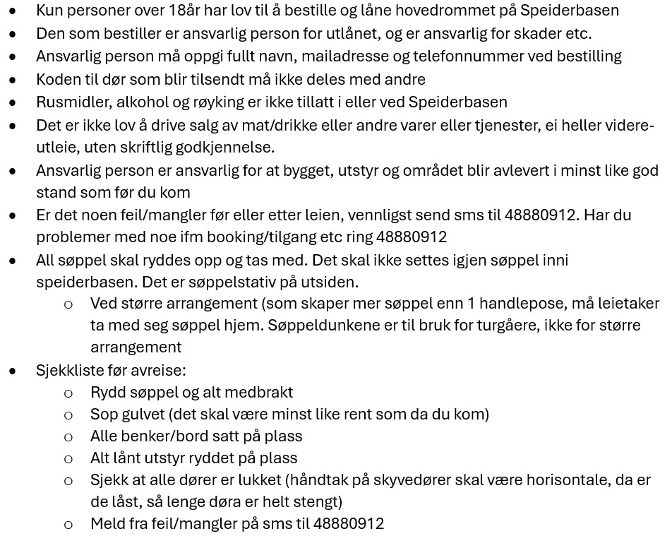 Når du har bestilt speiderbasen via linken over, så sender du en mail til speiderbasen.egersund@speiding.no med hvilke tilleggstjenester du ønsker, og så betaler du til Speiderbasen sitt vippsnummer 26943.