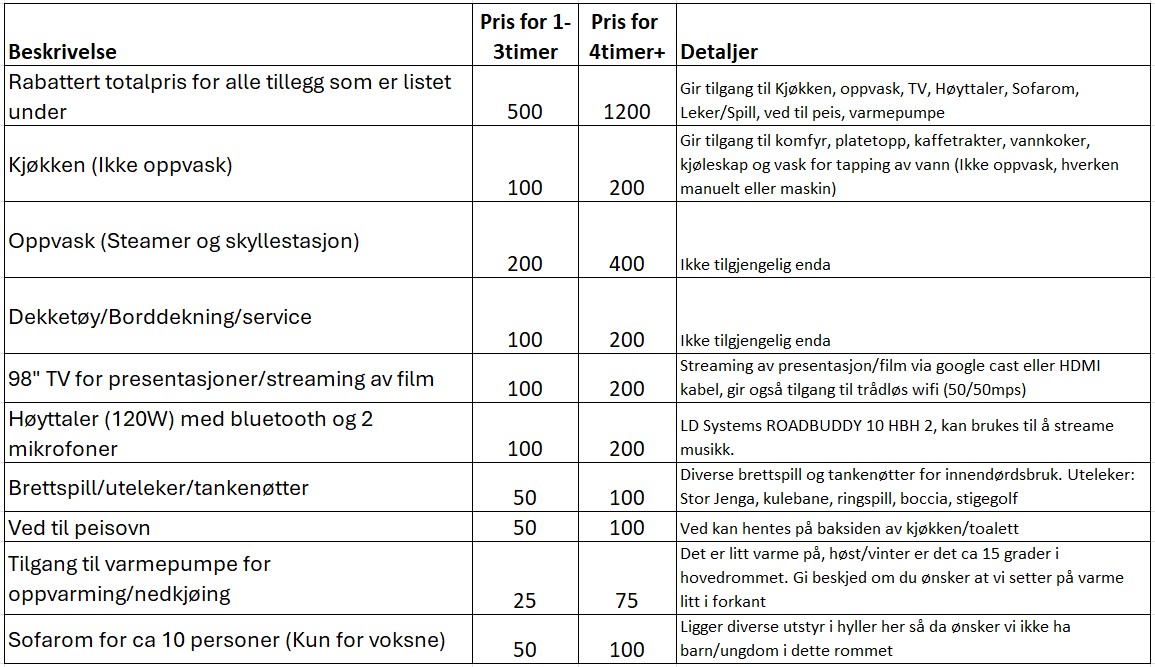 I tillegg til hovedrommet som er gratis, så er det også mulig å leie følgende tilleggstjenester;